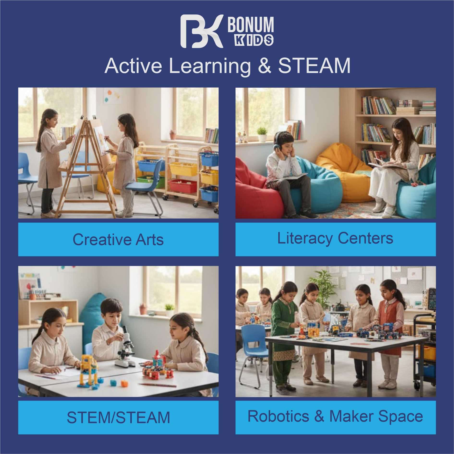 Dedicated maker-space and art equipment turn the classroom into a hands-on hub for innovation and creative expression.